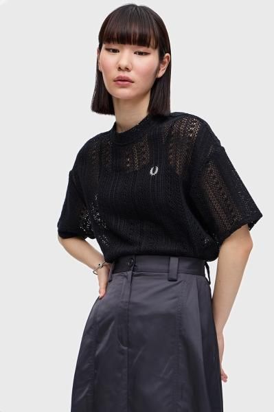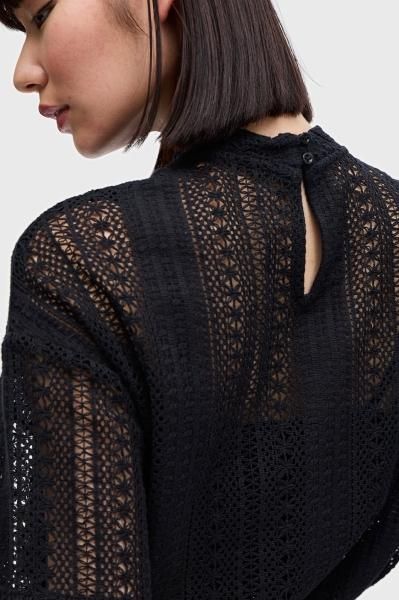 綿糸のラッセルレースを全面に使用したトップス。 バックネックが釦開きの低めのハイネック。繊細で透け感のあるレースが印象的な一枚です。